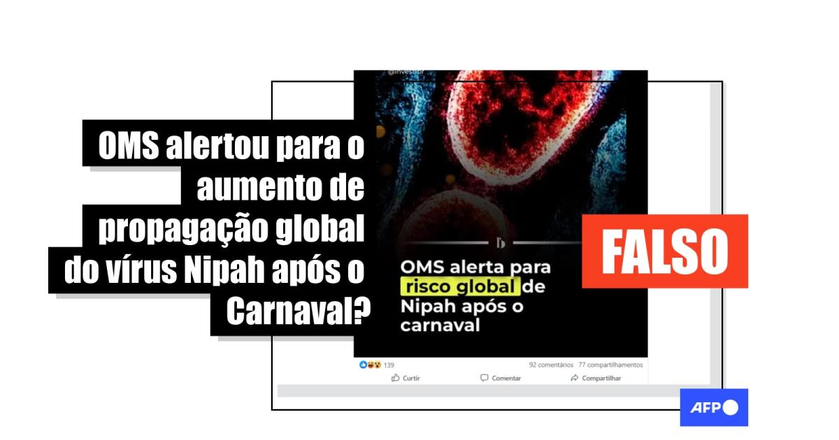 A confirmação de dois casos de contaminação pelo vírus Nipah, na Índia, fez com que diferentes países retomassem protocolos sanitários rigorosos no início de 2026. Não é verdade, no entanto, que a Organização Mundial da Saúde (OMS) tenha alertado para um risco global de propagação do patógeno após o Carnaval, como alegam publicações com milhares de interações nas redes sociais desde o último dia 30 de janeiro. A OMS classificou a transmissão do vírus como de baixo risco. O Ministério da Saúde do Brasil também afirmou que, até o momento, não há ameaça para a população brasileira.