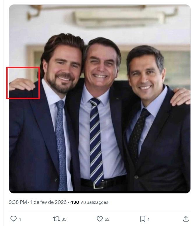 A imagem também apresenta indícios de manipulação digital: na mão esquerda do ex-presidente, por exemplo, não há nenhum dedo polegar.