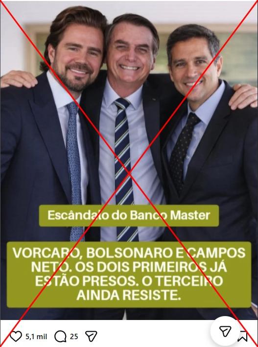 “Escândalo do Banco Master. VORCARO, BOLSONARO E CAMPOS NETO. OS DOIS PRIMEIROS JÁ ESTÃO PRESOS. O TERCEIRO AINDA RESISTE”, lê-se em uma imagem publicada no Instagram. O registro também foi compartilhado no Facebook e no X e pelo deputado federal Rogério Correia (PT-MG).
