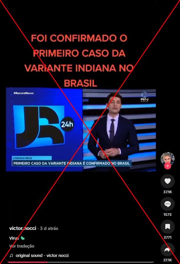 “FOI CONFIRMANDO O PRIMEIRO CASO DA VARIANTE INDIANA NO BRASIL”, lê-se em um vídeo compartilhado no TikTok, no Instagram, no Facebook e no Kwai.