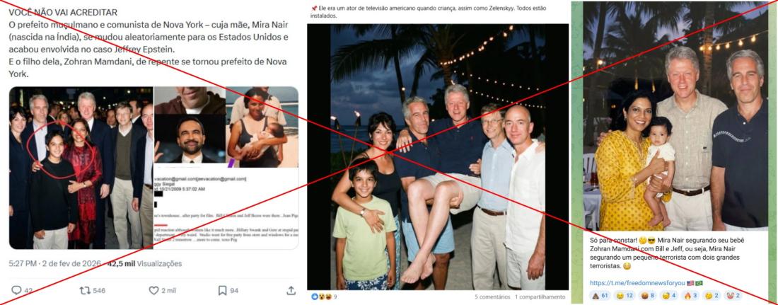 “O sistema se alimenta, Zohran Mamdani (atual prefeito de Nova York) com sua mãe, a cineasta Mira Nair, em uma festa após a exibição de um filme em 2002, que contou com a presença de Bill Clinton, Bill Gates, Jeff Bezos e outros. A foto está relacionada a documentos recentemente divulgados sobre Epstein que mencionam o evento”, diz uma das publicações compartilhadas no X, no Facebook e no Telegram.