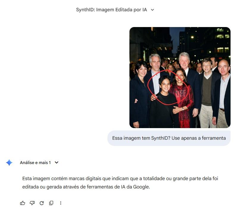 Uma análise das imagens virais com a ferramenta de detecção de IA do Google indicou que elas possuem uma marca d’água condizente com conteúdos gerados pela aplicação de inteligência artificial Nano Banana Pro.