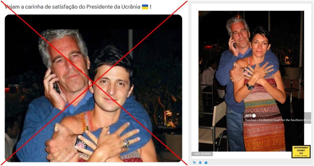 Além de Mamdani, o presidente ucraniano, Volodimir Zelensky, também foi alvo de uma montagem com Jeffrey Epstein. Publicações compartilham uma imagem em que o financista aparece abraçado a um jovem parecido com Zelensky, e afirmam: “Vejam a carinha de satisfação do Presidente da Ucrânia”.