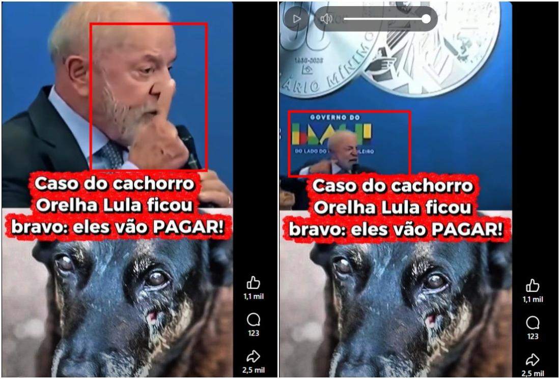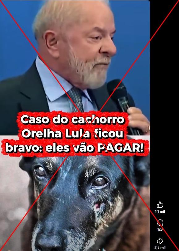 “Caso do cachorro Orelha Lula ficou bravo: eles vão PAGAR!”, lê-se na legenda sobreposta a um vídeo que circula no Instagram, no Facebook, no Threads, no TikTok, no YouTube e no Kwai.