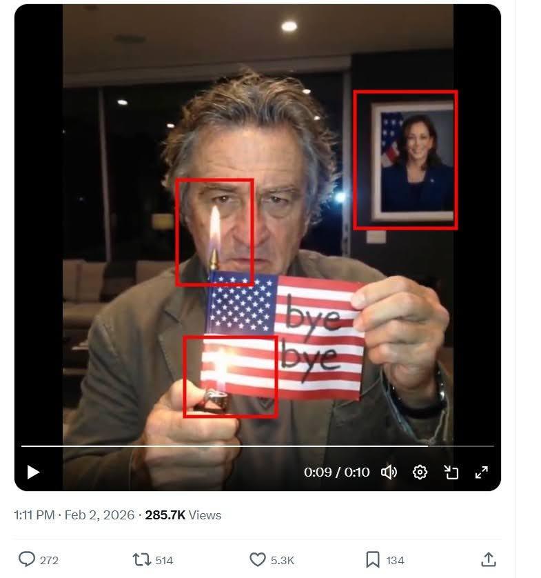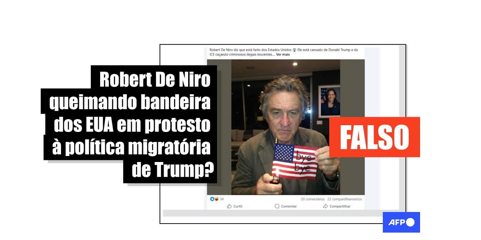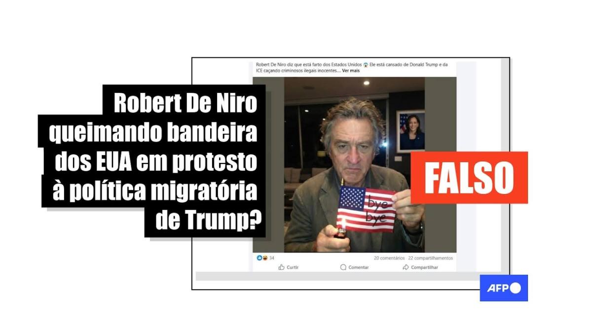 A política migratória do presidente norte-americano Donald Trump tem gerado uma onda de manifestações nos Estados Unidos, principalmente após a morte de Alex Pretti e Renee Good por agentes federais de imigração no primeiro mês de 2026. Mas, ao contrário do que afirmam publicações que somam mais de 6 mil interações nas redes sociais desde 25 de janeiro, um vídeo não mostra o ator Robert De Niro queimando uma bandeira dos EUA em protesto contra a política comandada por Trump. Apesar de De Niro ser um crítico do mandatário, a sequência viral foi criada com uso de inteligência artificial (IA).