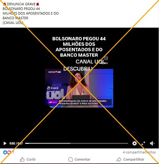 “Bolsonaro pegou 44 milhões dos aposentados e do Banco Master. Canal Uol Descobriu” é a frase sobreposta a vídeo compartilhado no Facebook, no Instagram, no Kwai e no TikTok.