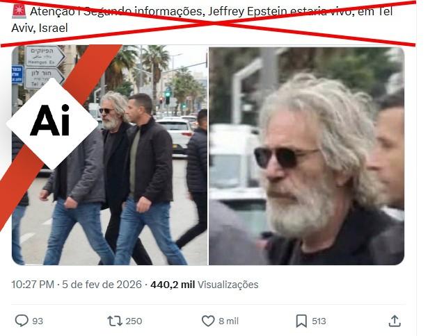 “Atenção l Segundo informações, Jeffrey Epstein estaria vivo, em Tel Aviv, Israel”, diz uma das mensagens que acompanham a imagem viral no X, no Instagram, no Facebook e no Threads.