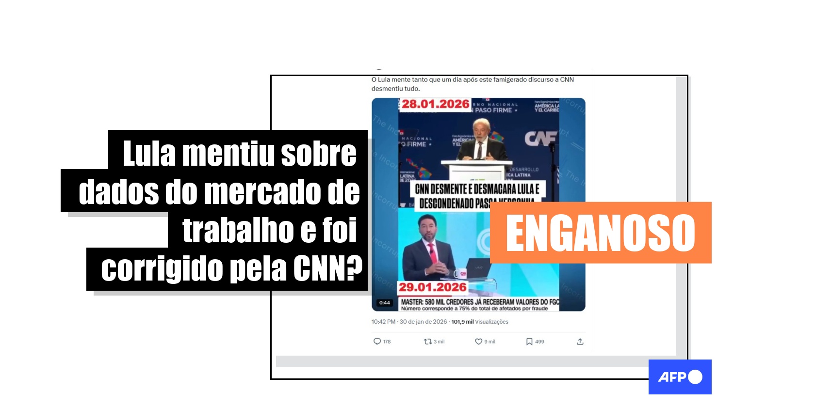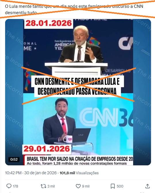 “CNN desmente e desmascara Lula e descoordenado passa vergonha”, diz uma legenda sobreposta a um conteúdo que circula no Instagram, no Facebook, no X, no Threads, no YouTube, no Kwai e no TikTok.
