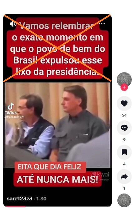 “Vamos relembrar o exato momento em que o povo de bem do Brasil expulsou esse lixo da presidência”, é a frase sobreposta ao vídeo compartilhado no Instagram, no TikTok e no Kwai.