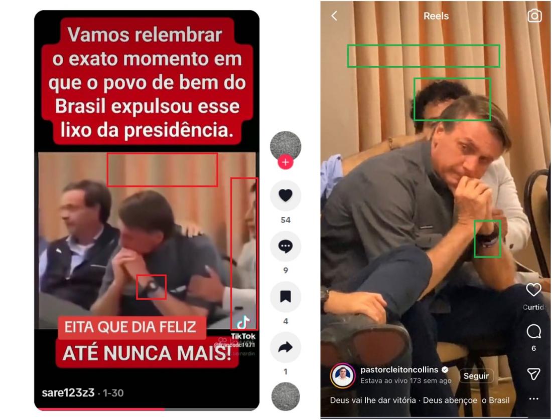 Uma comparação permite observar elementos semelhantes, como a vestimenta de Bolsonaro, o ambiente e as pessoas ao redor do político: