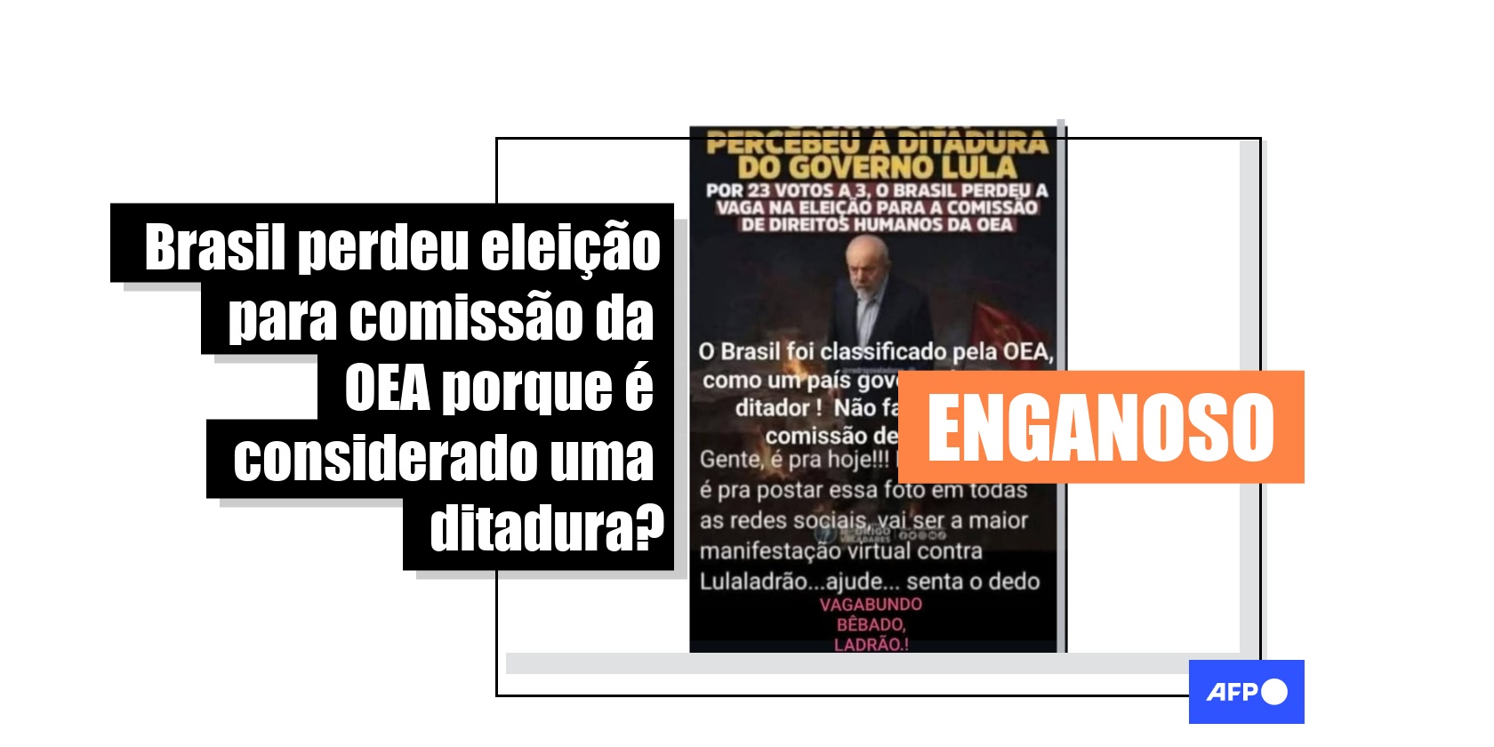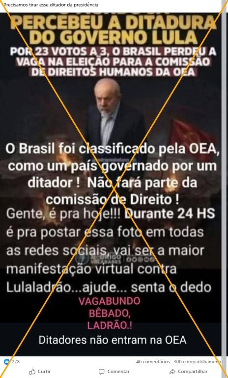 O conteúdo, que leva uma imagem do presidente Luiz Inácio Lula da Silva (PT), também alega que “por 23 votos a 3, o Brasil perdeu a vaga na eleição para a comissão de direitos humanos da OEA”.