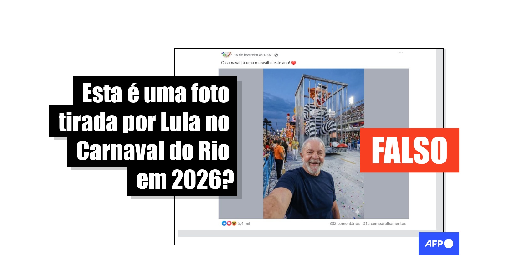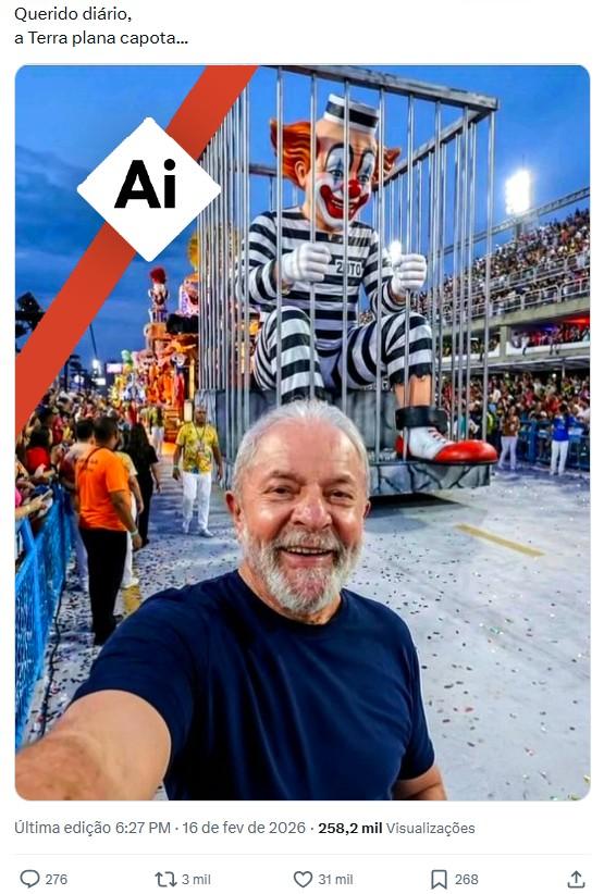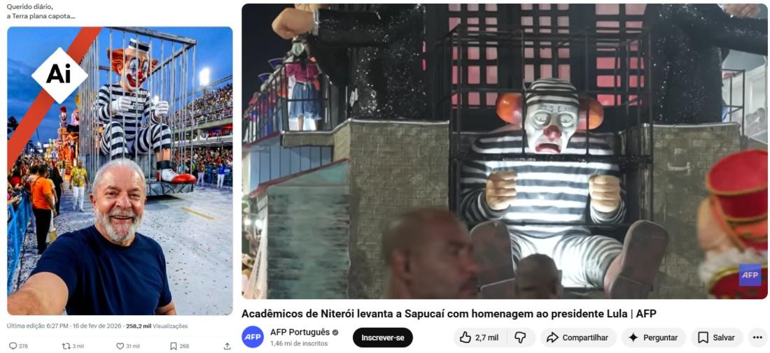 O presidente Luiz Inácio Lula da Silva (PT) foi homenageado em 15 de fevereiro de 2026 pela escola de samba Acadêmicos de Niterói nos desfiles de Carnaval do Rio de Janeiro, evento em que esteve presente. Desde então, uma suposta selfie de Lula em frente a um carro alegórico com uma representação do palhaço Bozo encarcerado com uma tornozeleira eletrônica — em alusão ao ex-presidente Jair Bolsonaro — acumula mais de 45 mil interações nas redes sociais. Mas o conteúdo foi criado com inteligência artificial.