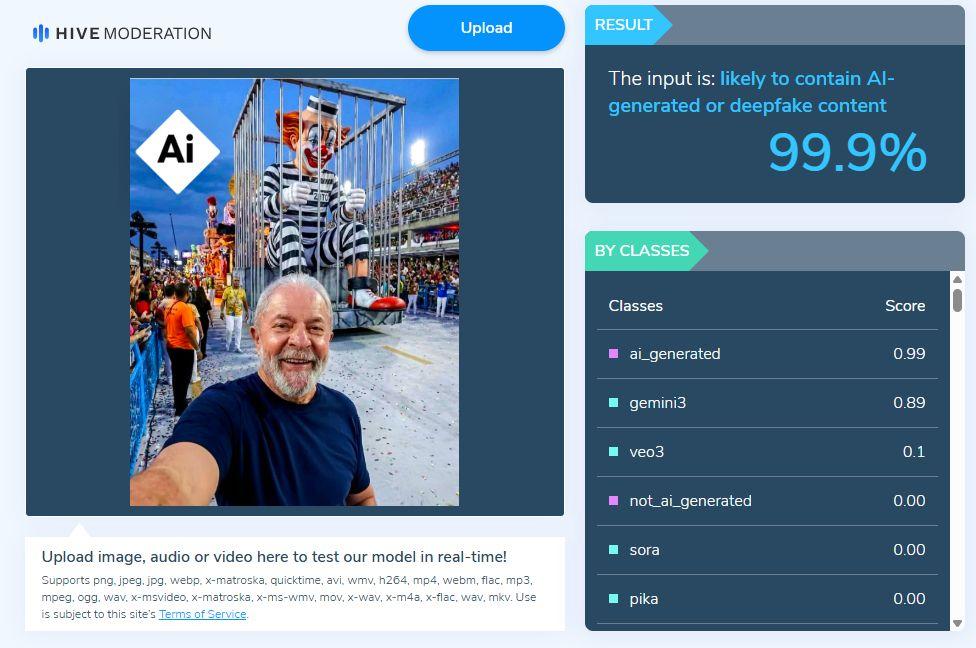 Uma análise da imagem com o detector de IA Hive Moderation também apontou que ela foi criada digitalmente, com 99,9% de probabilidade.