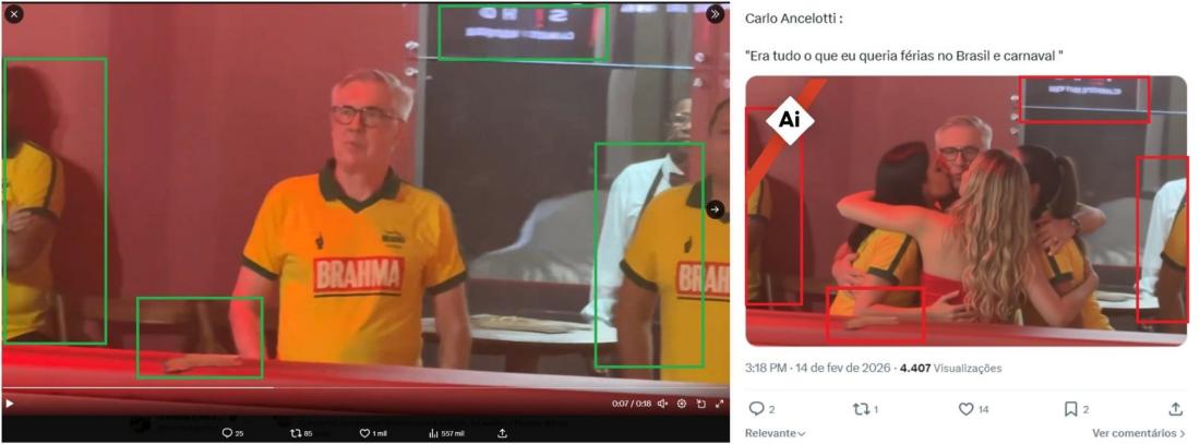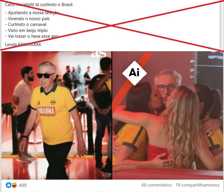 Em 13 de fevereiro de 2026, o técnico da Seleção Brasileira Carlo Ancelotti foi filmado em um camarote no Carnaval de Salvador. Desde então, circula nas redes sociais uma imagem com mais de 60 mil interações que mostraria o treinador beijando três mulheres. Mas o registro foi alterado por meio de inteligência artificial. Na gravação original, Ancelotti estava sozinho.