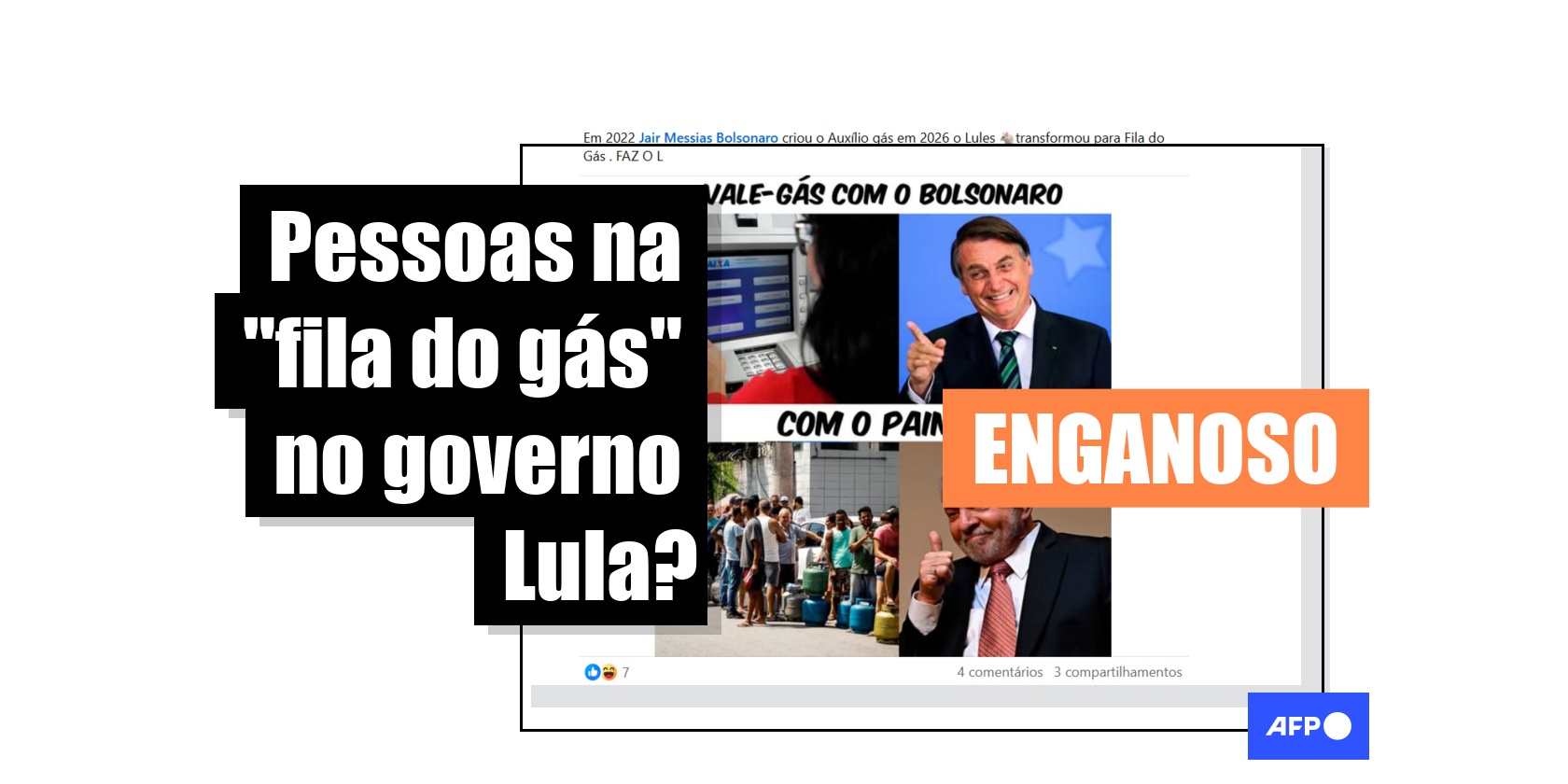 “Em 2022 Bolsonaro criou o Auxílio gás em 2026 o Lules transformou para Fila do Gás”, diz a legenda de publicações no Facebook e no X.