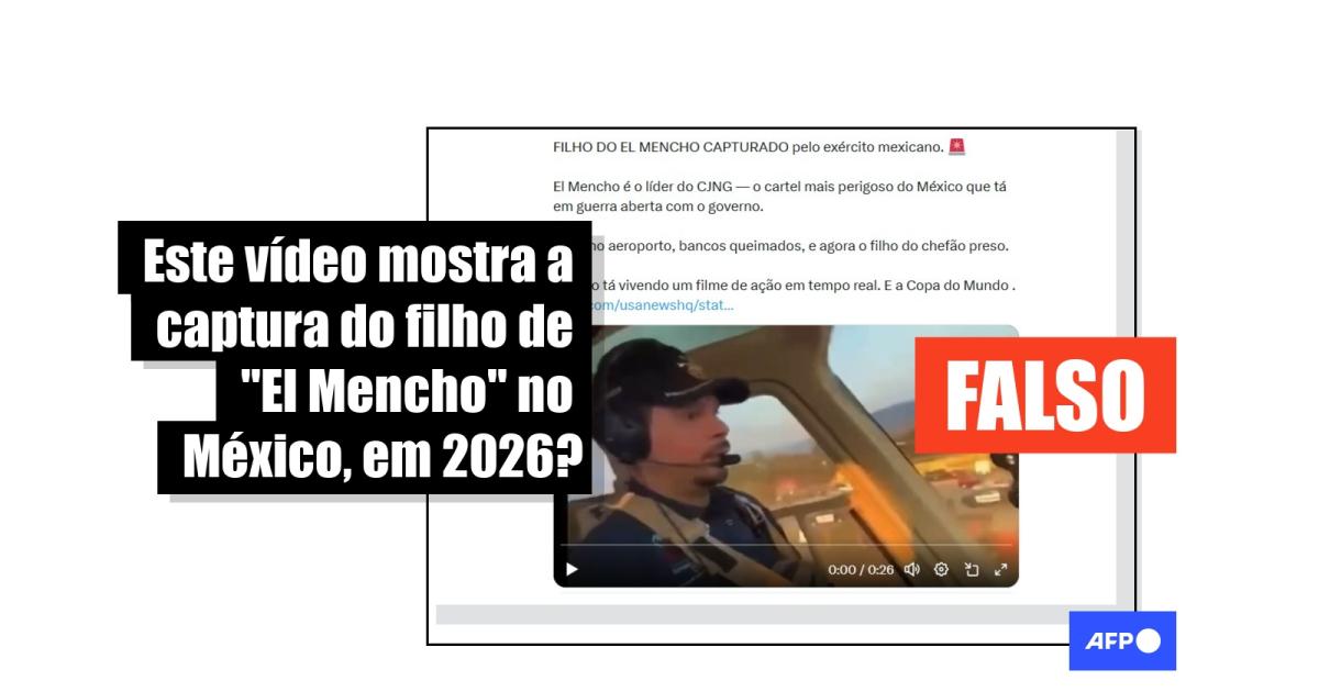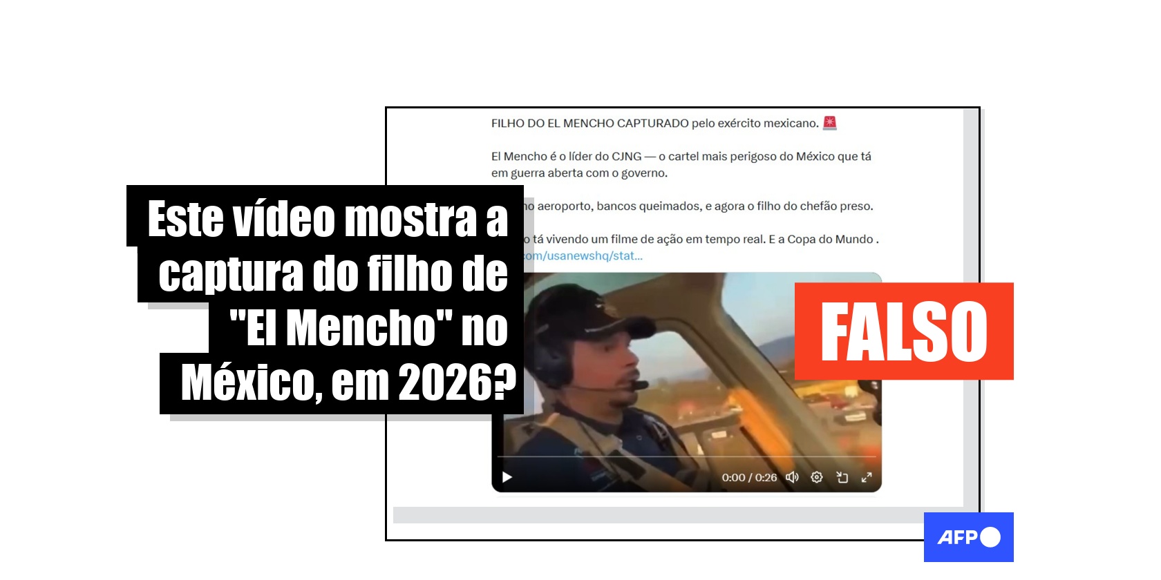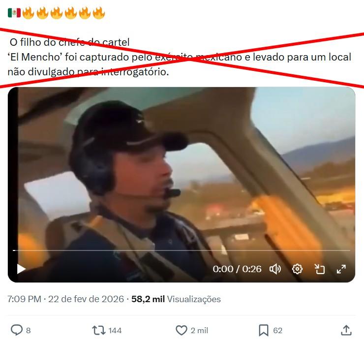 O governo do México executou, em 22 de fevereiro de 2026, o narcotraficante Nemesio Oseguera, conhecido como “El Mencho”, durante uma operação militar em Jalisco, estado do oeste mexicano, que desencadeou uma onda de violência no país. Desde então, publicações que somam mais de 91 mil interações nas redes sociais compartilham um vídeo da suposta captura do filho do criminoso durante a operação. Mas, na verdade, se trata da prisão de outro narcotraficante apelidado de “El Espíritu”, ocorrida em 4 de fevereiro em Chiapas, no sudeste do país.