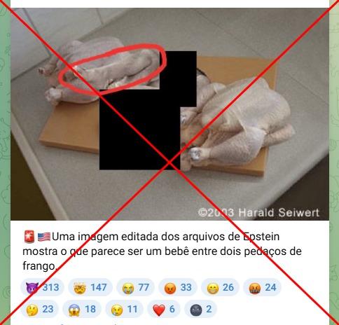 “Uma imagem editada dos arquivos de Epstein mostra o que parece ser um bebê entre dois pedaços de frango”, diz uma das publicações compartilhadas no Facebook, no Instagram, no Threads, no X e no Telegram.