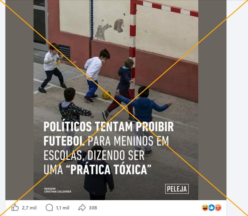 No final de janeiro de 2026, a coligação partidária Unidas Podemos apresentou uma proposta para transformar pátios de escolas de dois municípios de Ibiza, na Espanha, em “refúgios climáticos e inclusivos”. Após o anúncio, usuários de redes sociais passaram a afirmar enganosamente que o partido havia proposto a proibição do futebol nas escolas, em publicações com mais de 3 mil interações. No entanto, a proposta, enviada à equipe de checagem da AFP, não inclui a proibição do esporte, e sim um remanejamento do espaço dos pátios de recreio.