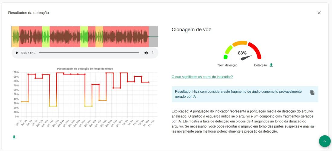 Uma análise do áudio do vídeo viral com a ferramenta Hiya, do plugin de verificação InVID-WeVerify, indicou que o conteúdo apresenta 88% de probabilidade de ter sido gerado por IA.