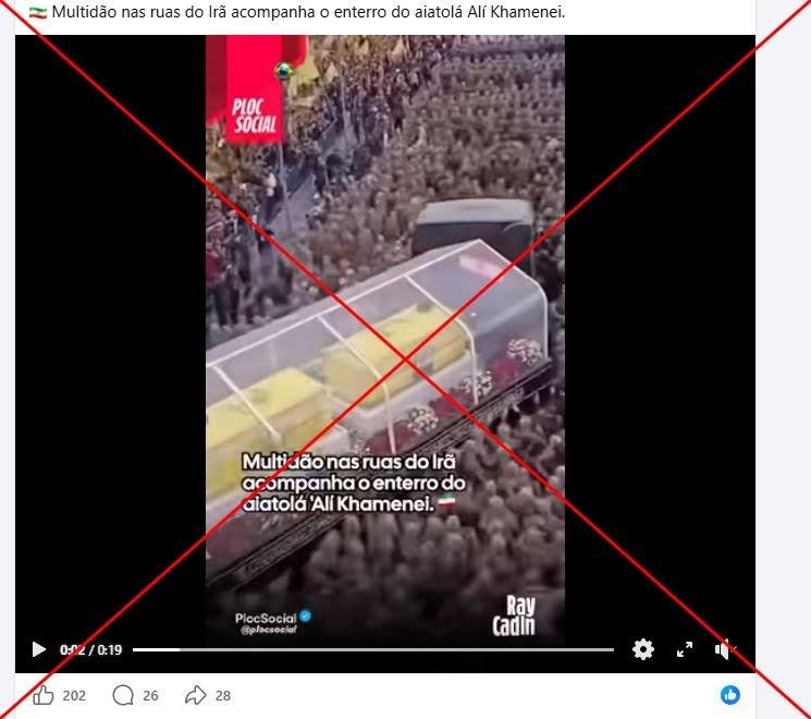 “Multidão nas ruas do Irã acompanha o enterro do aiatolá Alí Khamenei”, dizem publicações que acompanham a gravação viral no Facebook, no Instagram e no X.