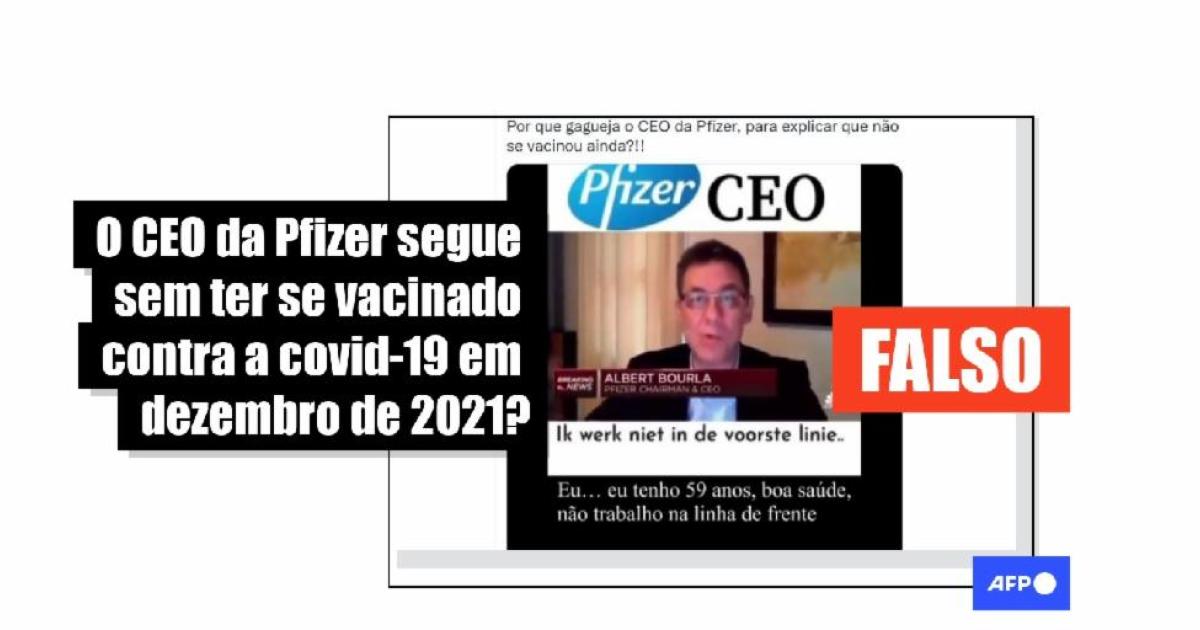 “Por que gagueja o CEO da Pfizer, para explicar que não se vacinou ainda?!!”, diz a legenda de uma das publicações compartilhadas no Twitter (1, 2, 3), acompanhada de um vídeo que mostra o CEO da Pfizer, Albert Bourla, falando sobre sua vacinação.