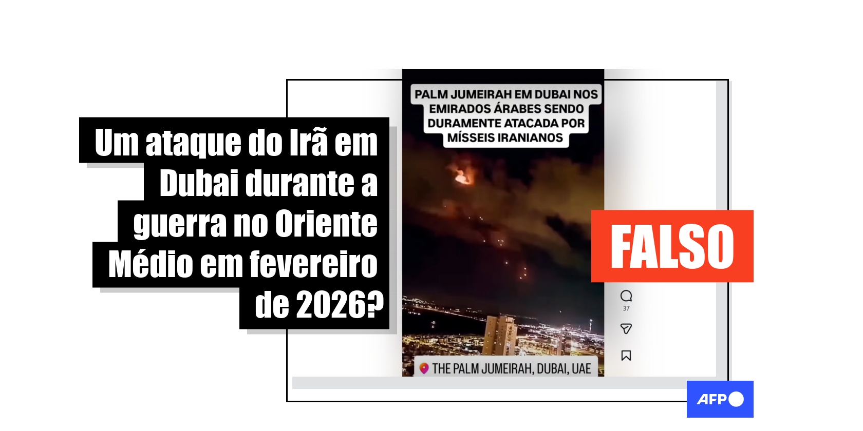 “Palm Jumeirah em Dubai nos Emirados Árabes sendo duramente atacada por mísseis iranianos”, diz a legenda de um vídeo compartilhado no Instagram, no Facebook, no Threads e no TikTok.