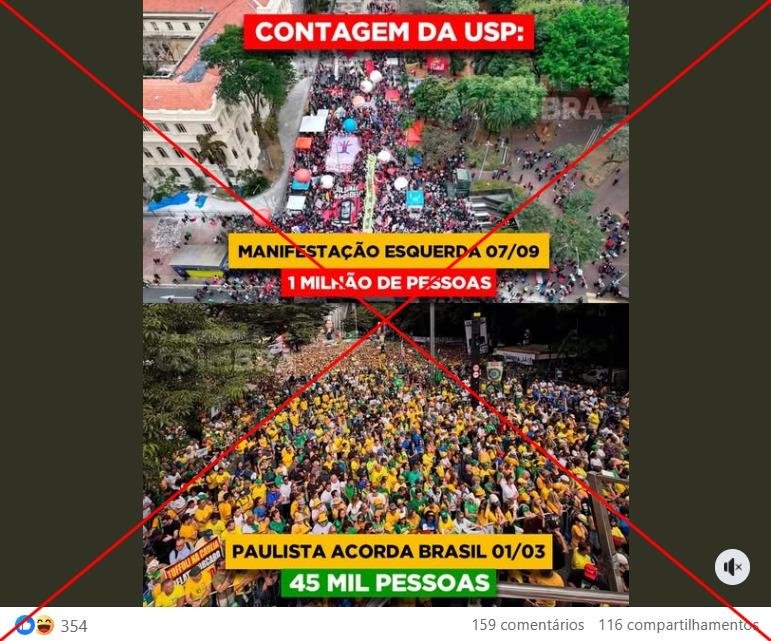 “Contagem da USP: Manifestação esquerda 07/09 1 milhão de pessoas. Paulista acorda Brasil 01/03 45 mil pessoas” lê-se em uma imagem publicada no Facebook e no Instagram.
