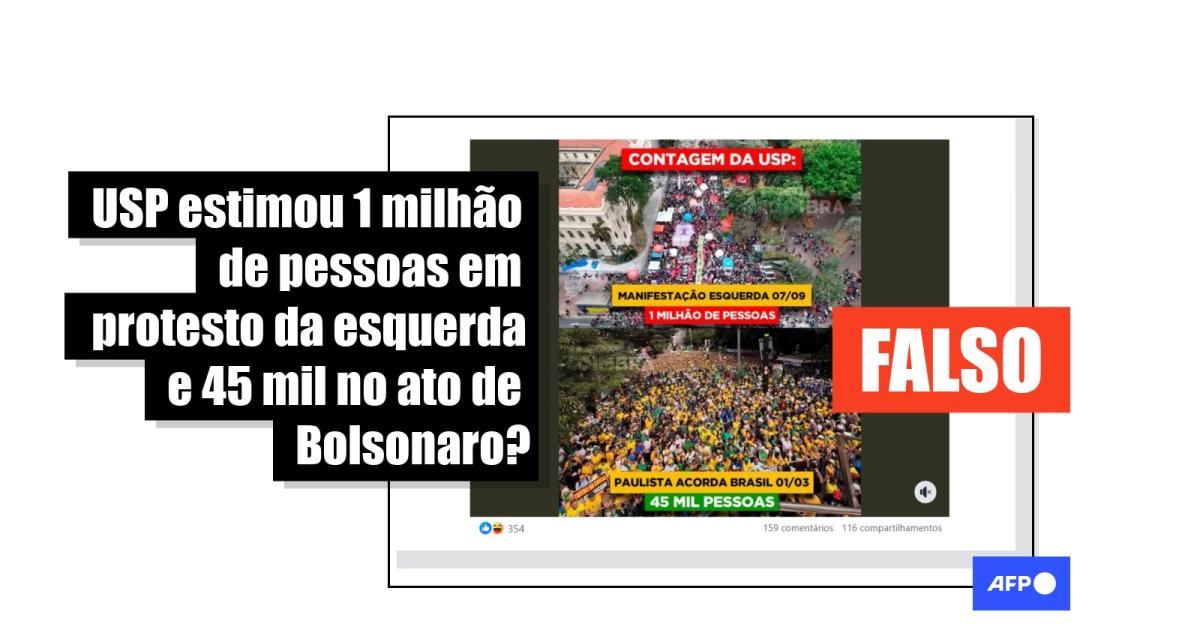 Apoiadores do ex-presidente Jair Bolsonaro se reuniram na Avenida Paulista, em São Paulo, em 1º de março de 2026, para apoiar a pré-candidatura de Flávio Bolsonaro (PL). Desde então, circula nas redes sociais uma imagem alegando que a Universidade de São Paulo (USP) teria calculado 45 mil pessoas no ato, enquanto teria estimado 1 milhão de manifestantes em um protesto associado à esquerda ocorrido em 7 de setembro de 2025. Isso é falso. Segundo dados divulgados pelo projeto, o ato de março de 2026 reuniu cerca de 20,4 mil pessoas, enquanto a manifestação em setembro teve 8,8 mil pessoas.