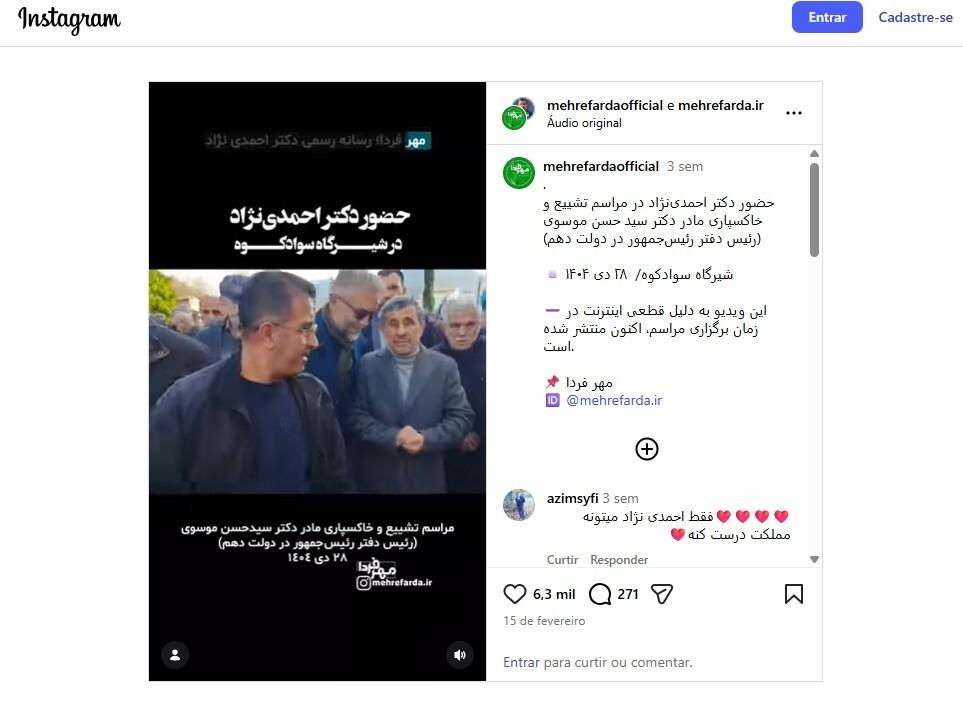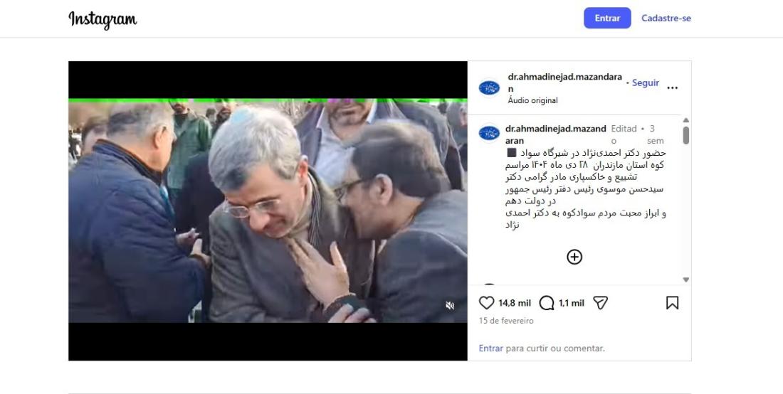 Uma busca reversa no Google Lens pela captura de tela de um trecho do registro viral exibiu a mesma gravação, publicada em 15 de fevereiro de 2026, no Instagram. De acordo com a legenda da postagem, Ahmadinejad estava participando do funeral da mãe de seu ex-vice-presidente e ex-chefe de gabinete, Seyyed Hassan Mousavi, na província de Mazandaran, no norte do Irã.