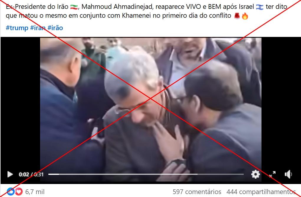 “Dado como morto por Israel, ex-presidente do Irã Ahmadinejad aparece vivo” é a frase sobreposta a vídeo no Facebook, no TikTok e no Kwai. Conteúdo semelhante circula no Instagram, no Threads, no Telegram e em espanhol.