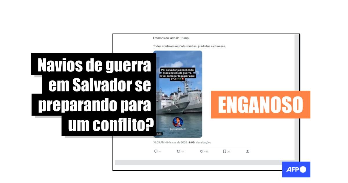 Parlamentares dos Estados Unidos divulgaram em 28 de fevereiro de 2026 um relatório que aponta a existência de uma suposta base chinesa na região de Salvador. Desde então, um vídeo com mais de 3 mil interações passou a circular como se indicasse uma preparação de navios de guerra para um conflito. No entanto, as embarcações estiveram abertas à visitação pública na capital baiana em janeiro, como parte de uma operação anual da Marinha, e já deixaram o local.