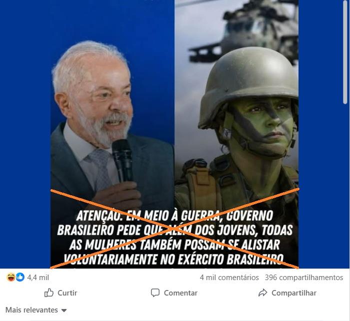 Outros conteúdos circulam com mensagens similares no TikTok, no Kwai e no X e acrescentam que o governo pediu que “todas as mulheres também possam se alistar voluntariamente no exército brasileiro”.