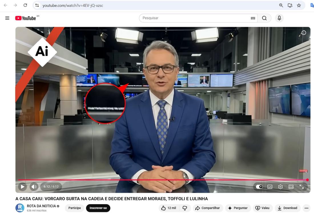 Ao analisar a sequência, é possível identificar elementos visuais característicos de conteúdos gerados por inteligência artificial (IA), como a narração robótica do apresentador, a falta de sincronia entre a fala e os movimentos dos lábios, e os escritos ao fundo que formam frases ilegíveis: