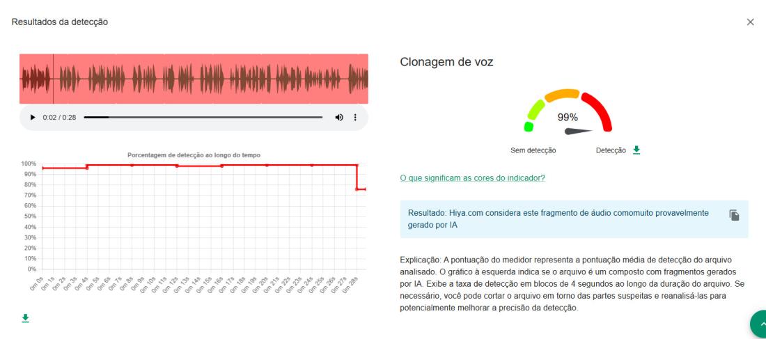 A sequência foi submetida ao Hive Moderation e ao Hiya do InVID WeVerify, ferramentas que identificam conteúdos produzidos por IA. Ambas apontaram alta probabilidade de o áudio do conteúdo ter sido criado digitalmente: