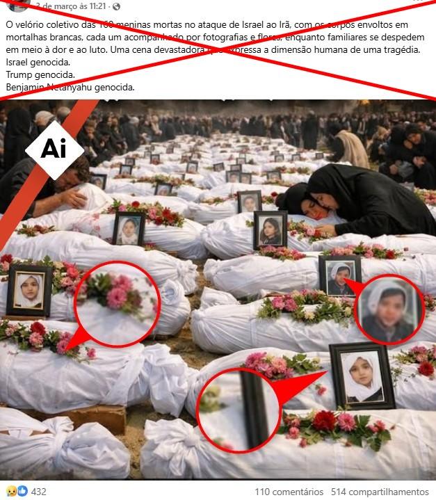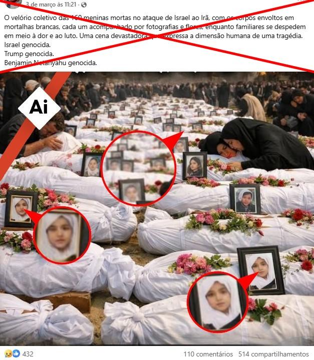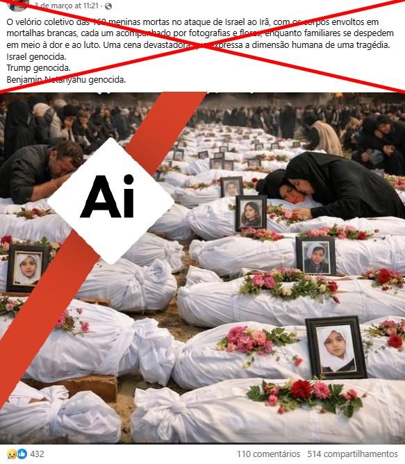 “O velório coletivo das 160 meninas mortas no ataque de Israel ao Irã, com os corpos envoltos em mortalhas brancas, cada um acompanhado por fotografias e flores, enquanto familiares se despedem em meio à dor e ao luto. Uma cena devastadora que expressa a dimensão humana de uma tragédia”, diz uma das publicações compartilhadas no Facebook, no Instagram, no Bluesky e no X.