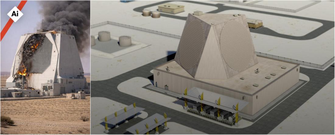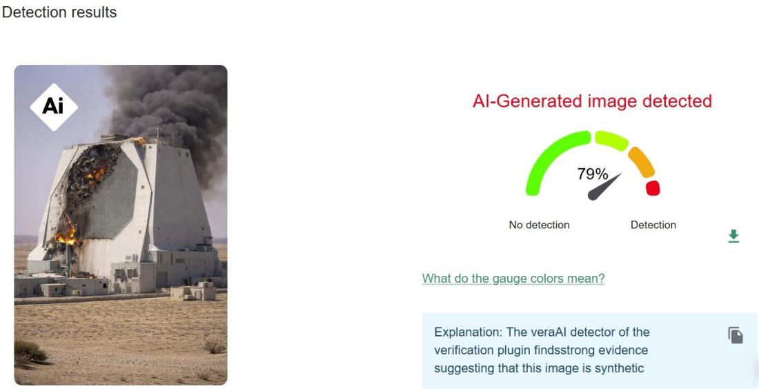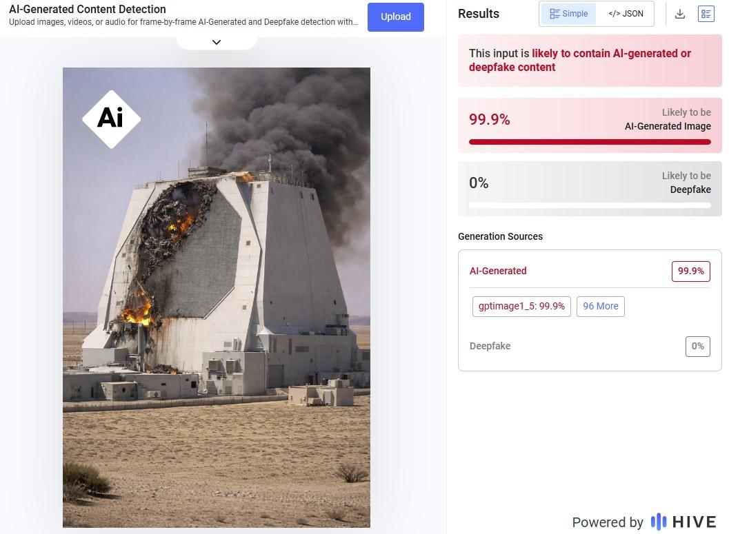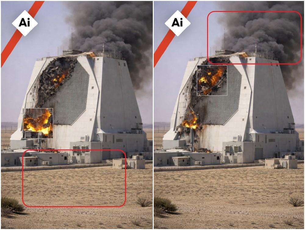 A imagem também apresenta diversas inconsistências visuais típicas de imagens manipuladas por IA. Os danos aos suposto radar aparecem como um padrão uniforme e concentrado em todo o edifício, em vez da destruição irregular que seria esperada após um ataque com mísseis.