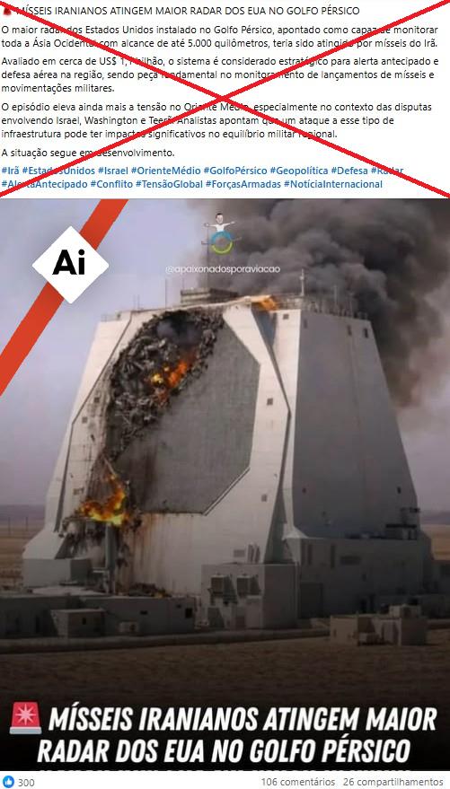 “Mísseis iranianos atingem maior radar dos EUA no Golfo Pérsico” é a legenda de publicação no Facebook. Conteúdo semelhante circula no Instagram, no Threads e em outros idiomas, como inglês, romeno, grego e espanhol.