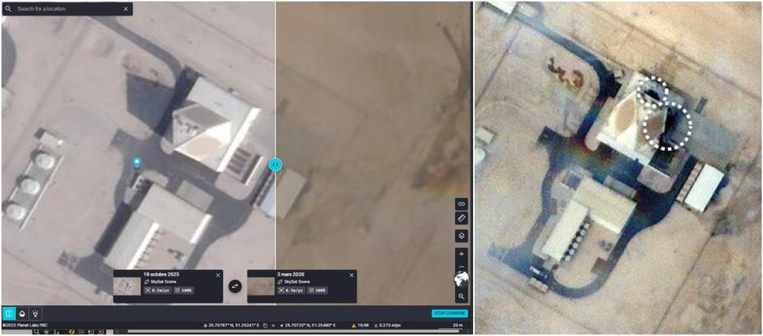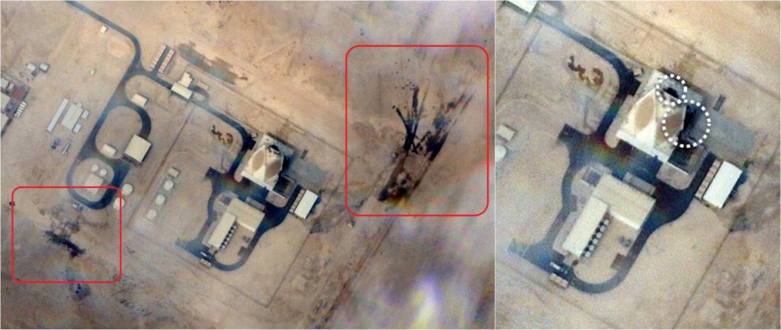Imagens de satélite mostram a estrutura do radar neste local e dois pontos escuros próximos, que podem indicar vestígios de danos causados pelo ataque.