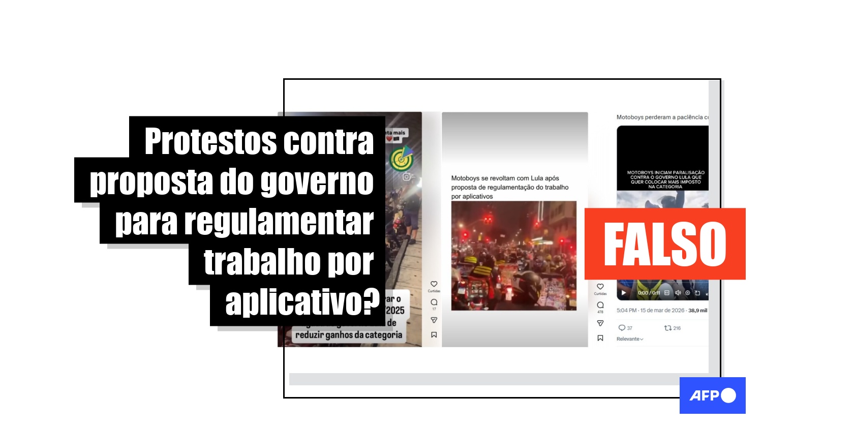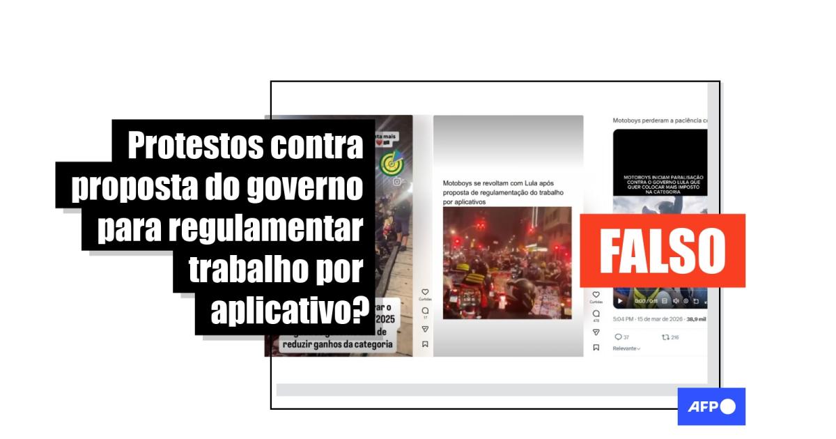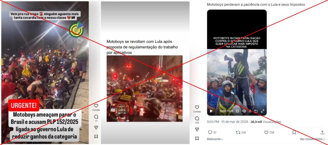 Em meio à tramitação do Projeto de Lei 152/2025, que visa regulamentar trabalhos por aplicativo, vídeos foram visualizados mais de dois milhões de vezes nas redes sociais como se mostrassem entregadores protestando contra a formulação da lei defendida pelo governo federal. Mas as imagens não têm relação com a proposta. Alguns dos vídeos mostram manifestações após a morte de entregadores no Rio de Janeiro, em janeiro de 2026, e outro foi feito durante um comboio noturno de um clube de motos para receber uma homenagem na Câmara Municipal de São Paulo.