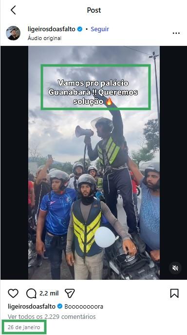 O vídeo viral em que um motoqueiro fala em um megafone parece ter sido gravado nessa manifestação. Uma busca reversa pelas imagens levou a uma publicação feita no Instagram por uma liderança da categoria no Rio de Janeiro na mesma data.