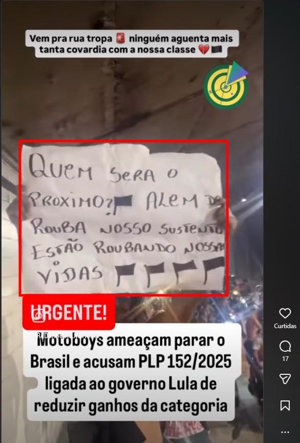 “URGENTE Motoboys ameaçam parar o Brasil e acusam PLP 152/2025 ligada ao governo Lula de reduzir ganhos da categoria”, diz texto sobreposto a um vídeo de motoqueiros em um túnel que circula no Instagram, no Facebook, no X, no Threads, no YouTube e no TikTok.