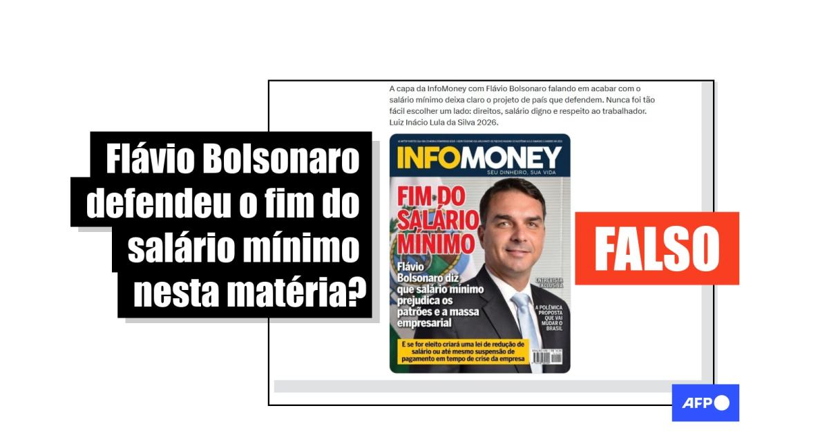 No início de março de 2026, o coordenador da pré-campanha presidencial de Flávio Bolsonaro (PL), o senador Rogério Marinho (PL), afirmou em uma entrevista que, caso eleito, o novo governo poderia revisar as reformas da Previdência e trabalhista. Desde então, publicações que somam mais de 151 mil interações nas redes sociais compartilham uma suposta capa do portal InfoMoney na qual Flávio Bolsonaro parece defender o “fim do salário mínimo”. Mas a imagem contém indícios de ter sido gerada por inteligência artificial (IA), e o InfoMoney sequer possui edição física.