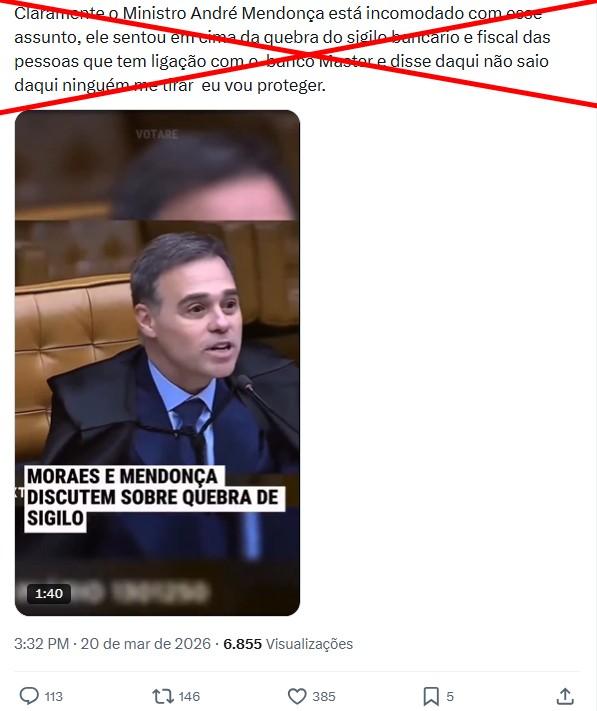 Após a prisão de Daniel Vorcaro, dono do Banco Master, em março de 2026, suposições sobre as conexões políticas do empresário repercutem em meio à possibilidade de uma delação premiada. Desde então, publicações que somam mais de 36 mil interações nas redes sociais compartilham o vídeo de uma discussão entre os ministros do Supremo Tribunal Federal (STF) André Mendonça e Alexandre de Moraes com a alegação de que eles teriam divergido sobre a quebra do sigilo de Vorcaro. Mas isso é falso: a gravação é de abril de 2025, quando a Corte analisava um recurso do Google no caso Marielle Franco.