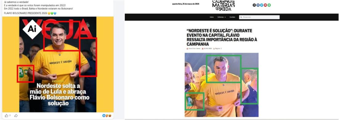 A suposta capa da Veja também apresenta inconsistências, principalmente no rosto do senador, características de conteúdos gerados por IA. No material, mudanças nos traços do político tornam sua imagem mais parecida com a de seu pai, o ex-presidente Jair Bolsonaro.