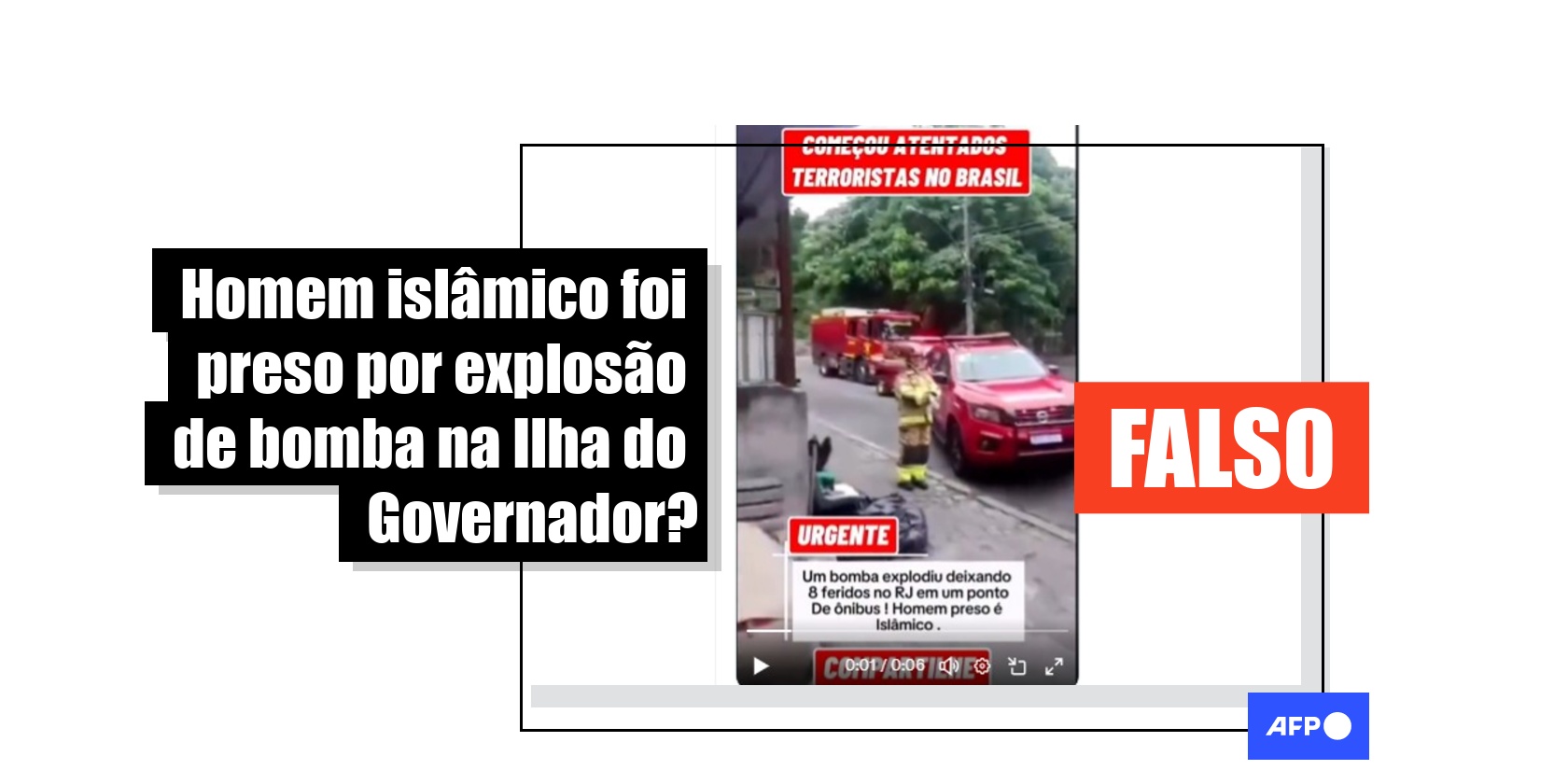 Em 20 de março de 2026, uma bomba caseira foi deixada em uma mochila em um ponto de ônibus na Ilha do Governador, no Rio de Janeiro, e explodiu causando ferimentos em oito pessoas. Diante disso, publicações nas redes sociais visualizadas mais de 600 mil vezes alegam que um homem islâmico teria sido preso pelo ocorrência. No entanto, o artefato explodiu após uma das vítimas manusear a mochila e nenhum suspeito foi preso, como confirmou a Polícia Militar do Estado do Rio de Janeiro à AFP. O caso segue em investigação.