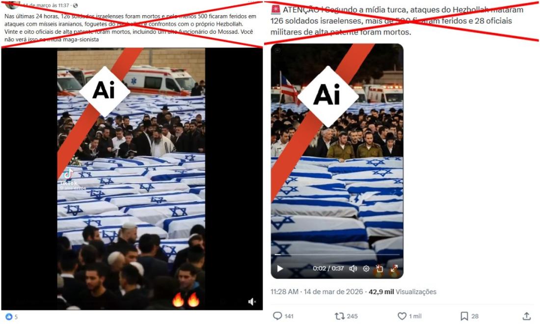 A guerra no Oriente Médio entrou em sua quarta semana em 22 de março de 2026, com a maior parte das vítimas registrada no Irã e no Líbano, enquanto Israel reporta pelo menos 16 mortos. Em meio ao conflito, publicações que acumulam mais de 5 mil interações nas redes sociais compartilham vídeos que supostamente mostram funerais coletivos de soldados israelenses, nos quais dezenas de caixões aparecem alinhados e cobertos com a bandeira de Israel. Mas as gravações circulam desde, pelo menos, 2025 e apresentam indícios de terem sido geradas por inteligência artificial (IA).