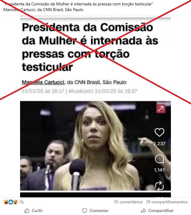 “Presidenta da Comissão da Mulher é internada às pressas com torção testicular”, lê-se na captura de tela de uma suposta notícia atribuída à CNN Brasil que circula no Instagram, no Facebook, no Threads, no X e no TikTok. Vídeos em que pessoas reagem rindo da suposta notícia também circulam amplamente nas redes.