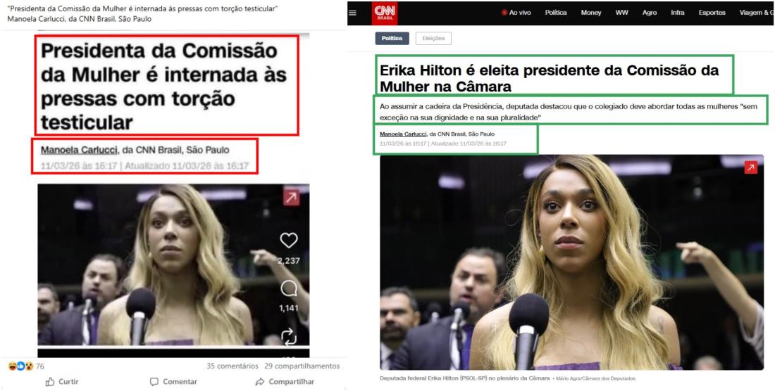 A deputada federal Erika Hilton (PSOL) se tornou a primeira mulher transgênero a ser presidente da Comissão dos Direitos das Mulheres da Câmara dos Deputados, em 11 de março de 2026. A eleição foi criticada pela oposição e a parlamentar passou a ser alvo de ataques transfóbicos. Nesse cenário, um conteúdo com mais de 1,8 milhões de interações passou a difundir uma suposta manchete da CNN Brasil com a informação de que a deputada teria sido internada por uma “torção testicular”. No entanto, o título de uma notícia do veículo foi manipulado para incluir a mensagem falsa.