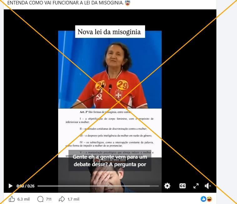Na parte inferior, os posts exibem ainda um suposto trecho do projeto, elencando formas de misoginia que passariam a ser crimes, entre elas: “atitudes cotidianas de discriminação contra a mulher” e “a interrupção constante da palavra, como forma de impedir a mulher de se pronunciar”.