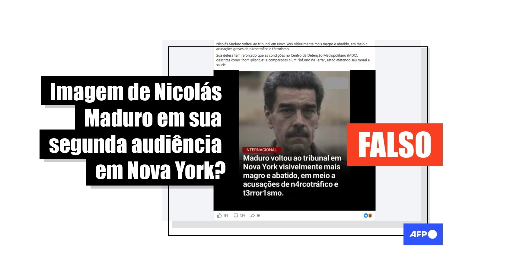 Em 26 de março de 2026, o presidente deposto da Venezuela Nicolás Maduro se apresentou diante de um tribunal em Nova York, em sua segunda audiência desde que foi capturado pelos Estados Unidos pela acusação de narcotráfico. Desde então, publicações nas redes sociais com mais de 123 mil interações compartilham uma suposta foto de Maduro “mais magro e abatido” nessa audiência. Mas a imagem foi criada com inteligência artificial, como indicam uma análise visual e a inexistência de fotos públicas da audiência.